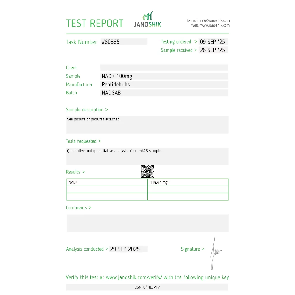 Saw a new lab report floating around for Peptide Hubs NAD+ (100 mg/vial) and figured I’d share it here since there’s not a ton of verified data on this compound yet. This one wasn’t tested by me — came from an independent lab that’s been posting several peptide results lately.